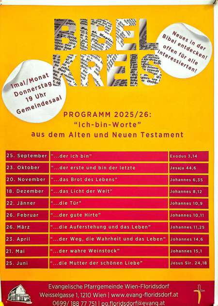 Im Bibelkreis finden wir Antworten auf unsere Fragen und kommen so zu neuen Denkanstößen. Auf jeden Fall sprechen wir über Gott und die Welt, wir lesen unterschiedliche Bibeltexte, diskutieren und vergleichen es mit unserer heutigen Situation und unseren Erfahrungen.