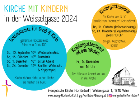 Für die ganz Kleinen (0-6 Jahre) findet um 15.00 Uhr in der Kirche zu den unten stehenden Terminen ein kurzer Krabbel-Gottesdienst mit einfachen, leicht verständlichen Geschichten statt. Es gibt immer etwas zum Mitmachen. Niemand muss still sitzen oder ruhig sein. Im Anschluss an den Gottesdienst laden wir zu einer Jause ein.